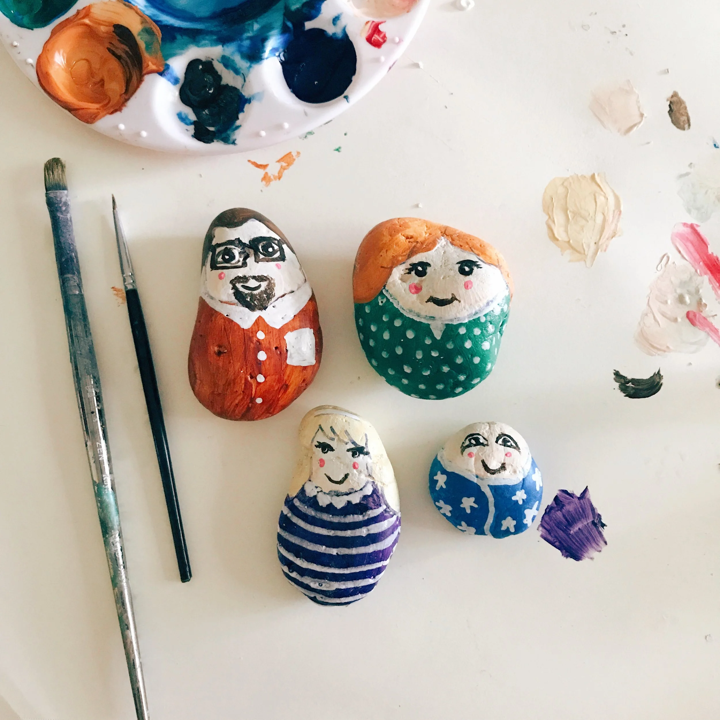 To begin, let's get out our paint and brushes, and collect some smooth rocks to make some cutie painted rock family portraits! We found a bag of river rock at At Home, if you can't find some in nature.