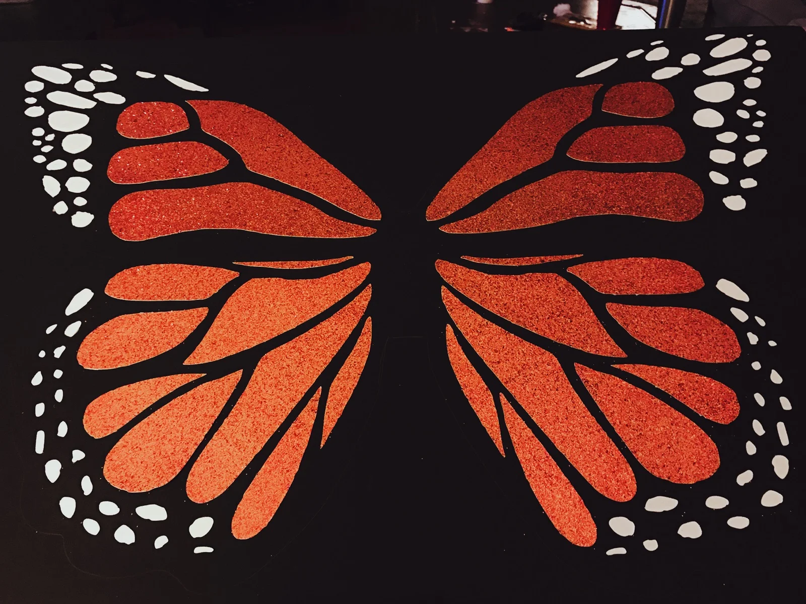 Use Silhouette Studio to cut out the wing shapes. There is a glitter paper setting, but you may have to play with your settings to get it right depending on the brand and weight of your paper. In the file, I have included the upper wing shapes and lower wing shapes. Cut two of the upper wing shapes. Then move the lower wing shapes to the cutting area, and cut two of those. After those have finished cutting, open the dots file, and cut two using the white glitter paper.