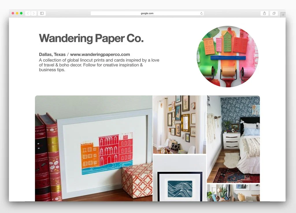 My goal with the WPC Pinterest is to showcase my work, but I also want to create a resource for other aspiring printmakers or creative business owners. The Pinterest page will provide solutions to common business questions and problems with links to helpful articles. It will also have lots of printmaking ‘how-to’ articles and inspiration. Plus, it will have boards dedicated to beautiful global décor examples and light-filled creative spaces to help us stay inspired and dream about the future. I really wish I'd had a resource like this when I was first starting out, so I can't wait to share it!