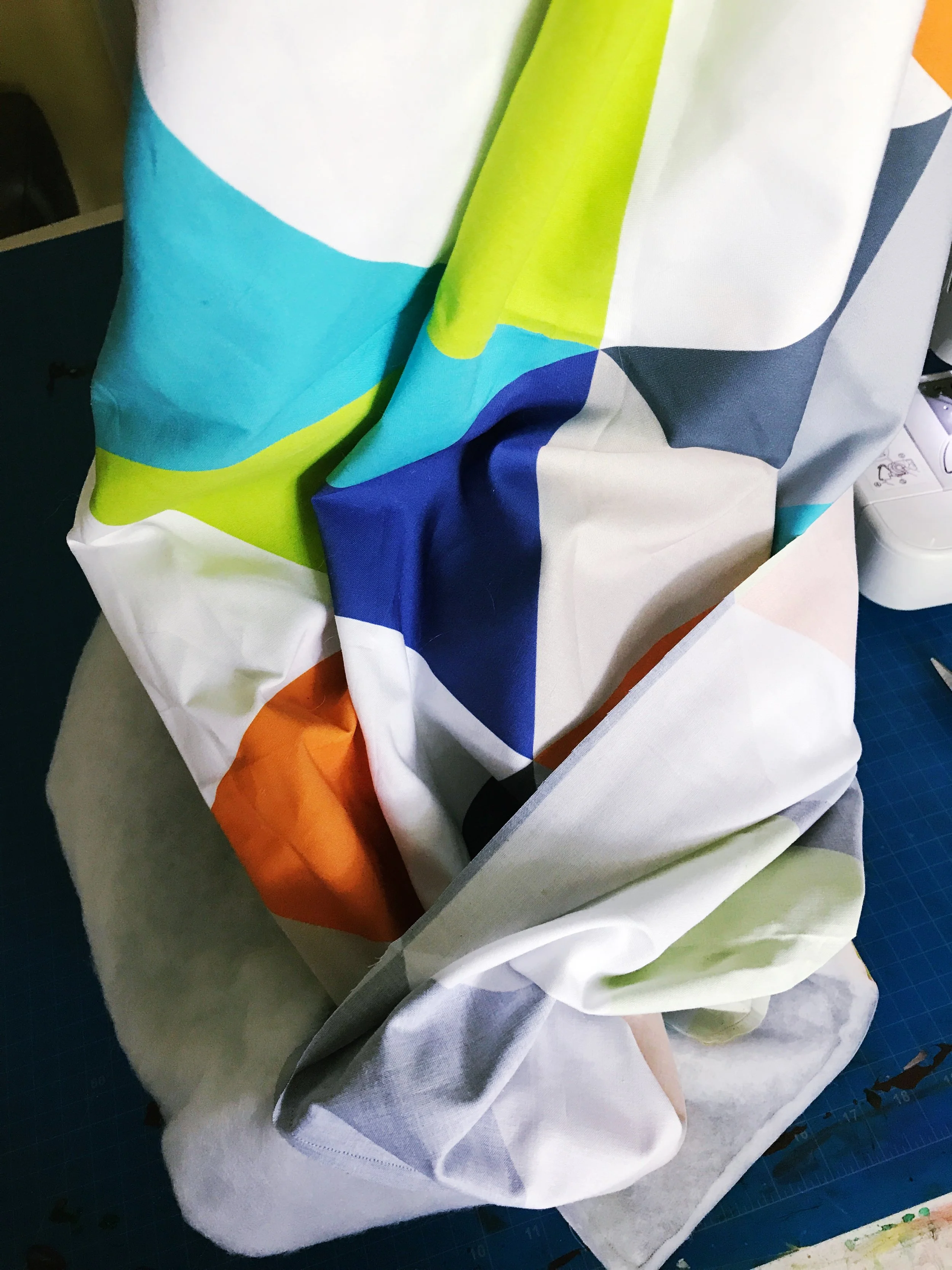 I finally made some time to work on his cheater baby quilt, so I took some pics to share with you all how easy it is to do something custom and special. This fabric actually inspired the color palette for the whole space. I bought two yards of the Kona Cotton from Spoonflower (search cheater quilt for different designs), and one package of crib sized batting from amazon. This process is very simple, and the results look much more impressive than it actually was to create.